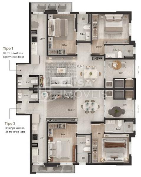 • Tipo 01 e 02 | 138.00m² de Área Total, 83.00m² Privativos | 02 Suítes + Sacada c/Churrasqueira + Living + Lavabo + Área de Serviço