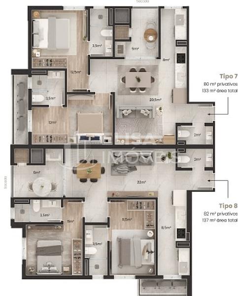 • Tipo 05 e 04 | 137.00m² de Área Total, 82.00m² Privativos | 02 Suítes + Sacada c/Churrasqueira + Living + Lavabo + Área de Serviço