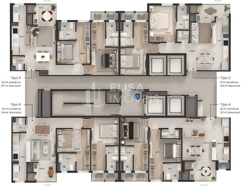 • Tipo 03 e 06 | 134.00m² de Área Total, 80.00m² Privativos | 02 Suítes + Sacada c/Churrasqueira + Living + Lavabo + Área de Serviço